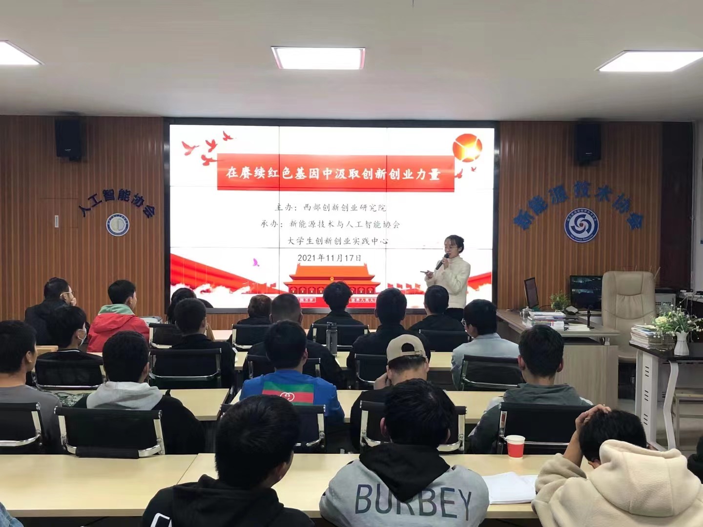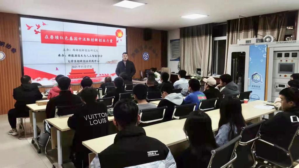 11月17日西部创新创业研究院立足我校“双高计划”建设实际,为培育学生创新创业能力,激发学生创业动力,拓展学生成长成才的路径并结合我院党史教育,联合新能源技术与人工智能协会、大学生创新创业实践中心在行知A楼410新能源技术协同创新中心,开展了以“在赓续红色基因中汲取创新创业力量”为主题的专题讲座活动。