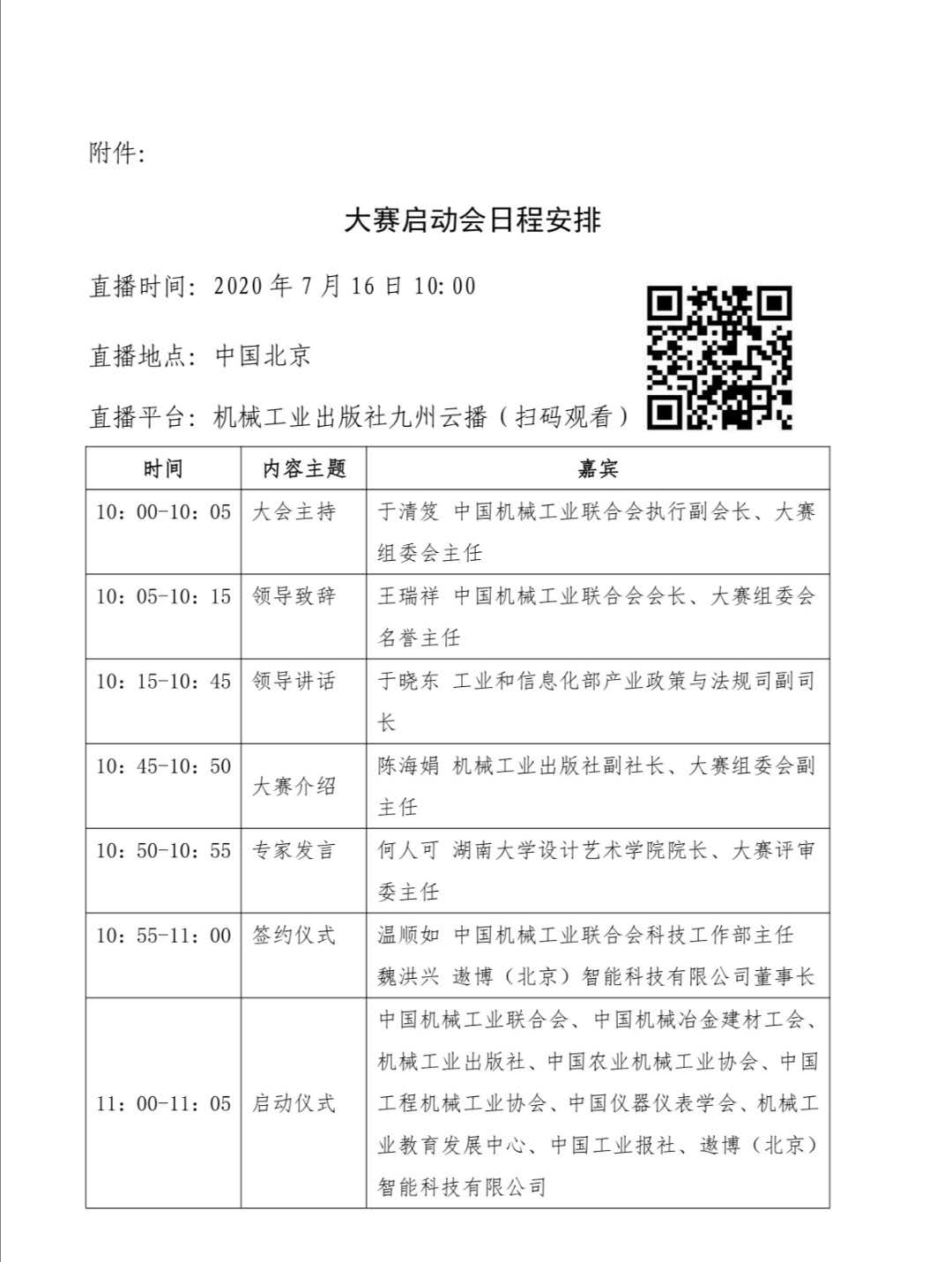 2.会议主要内容:中国机械工业联合会会长致辞、工信部政法司领导讲话、组委会进行大赛介绍、评审委专家发言、举行签约仪式、启动仪式。