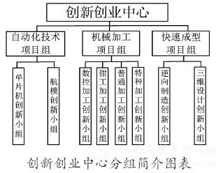 根据专业特点和兴趣开放实验实训室,为学生提供创新创业的场地和实验条件,完善创新创业章程和管理制度,选拔成立创新创业小组,在选拔发展和注重基本专业技能培养的同时,也要注重能力结构搭配和人才梯队的建设。结合学校专业特点培养学生能力,进一步加强创新小组的管理和日常创新活动的开展,成立创新创业中心,具体模式如下图所示。