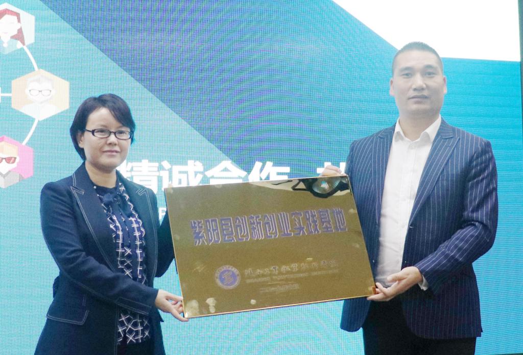 财经与旅游学院院长吴姗娜和青创会常务副会长陈德甫为“紫阳县创新创业实践基地”揭牌