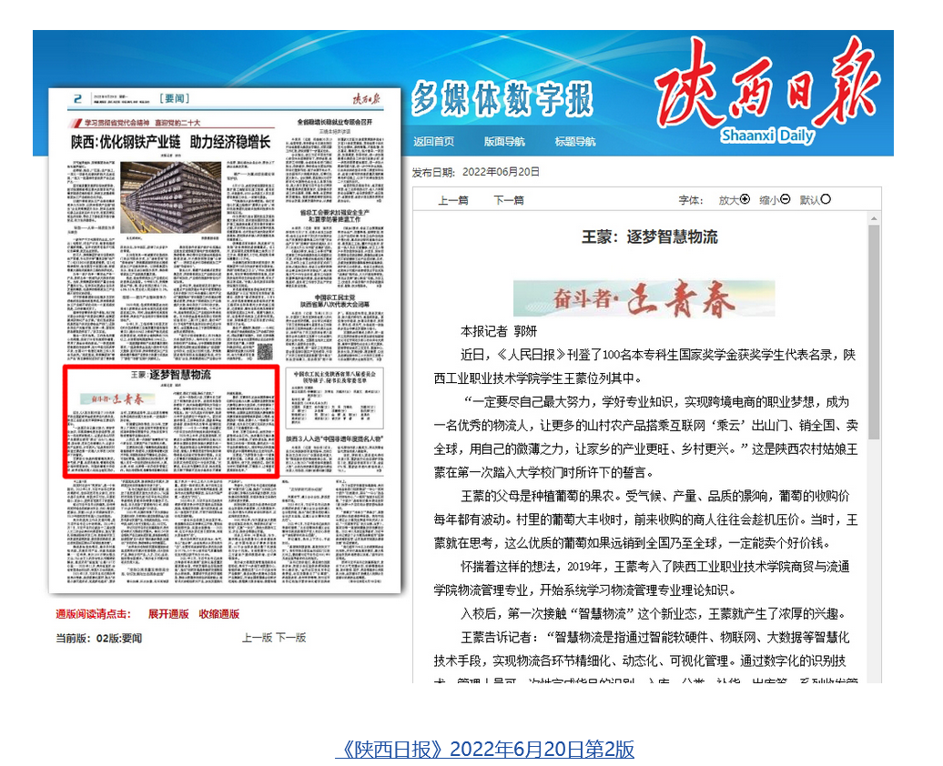 6月20日,《陕西日报》以“王蒙:逐梦智慧物流”为题,报道我校国家奖学金获奖学生,全文如下: